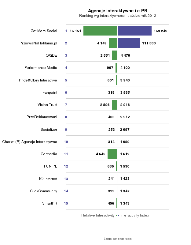 Pod względem Interactivity Index najwyżej uplasowały się strony Get More Social, PrzerwaNaReklame.pl oraz OXiDE. Względna interaktywność, mierzona wskaźnikiem Relative Interactivity, okazała się najwyższa dla stron Get More Social, Cormedia i PrzerwaNaReklame.pl