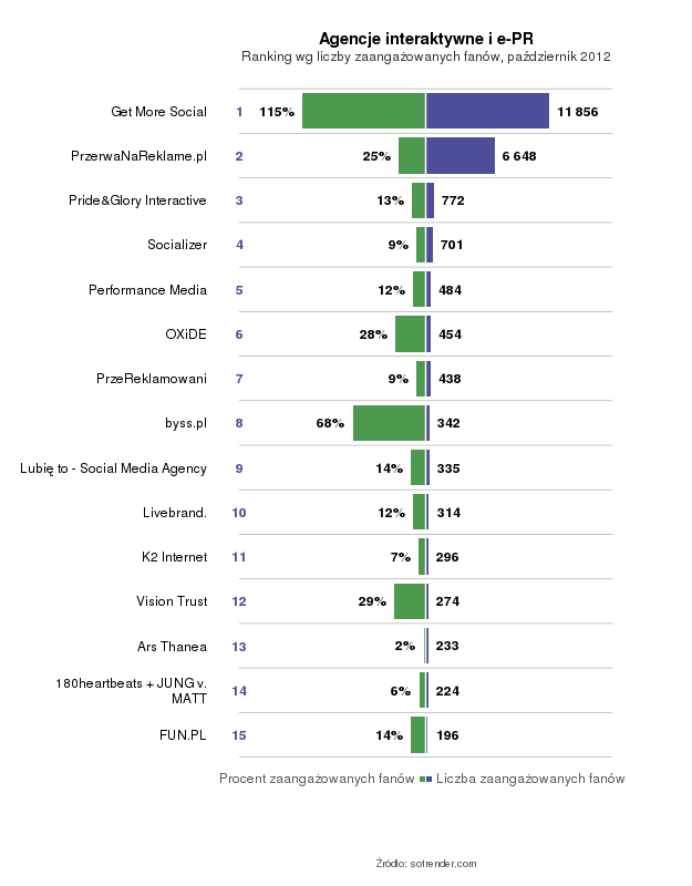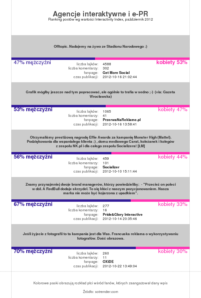 Najwięcej użytkowników Facebooka zaangażowały strony Get More Social, PrzerwaNaReklame.pl i Pride&Glory Interactive. Największy odsetek zaangażowanych fanów obserwowaliśmy na stronach Get More Social, byss.pl i Vision Trust.
