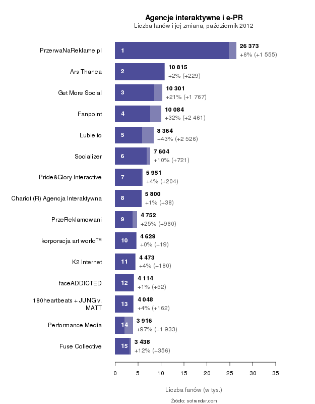 Największe strony w grupie to PrzerwaNaReklame.pl, Ars Thanea i Get More Social. Największy procentowy przyrost liczby fanów zaobserwowaliśmy na fan page’ach Performance Media, Lubie.to i Fanpoint. Najwięcej fanów przybyło stronom Lubie.to, Fanpoint i Performance Media.