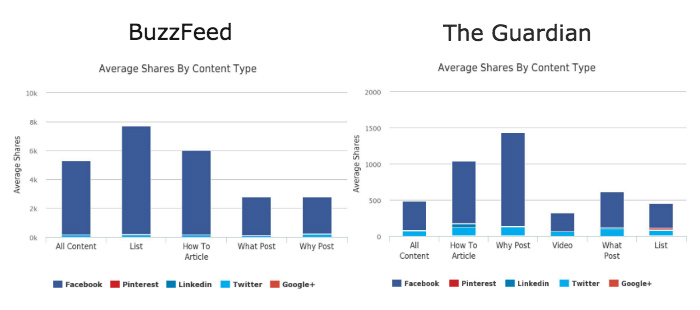 Co sprawiło, że najważniejszy za oceanem liberalno-lewicowy dziennik zwrócił swoją uwagę ku cokolwiek ludycznej formie quizu? To szturmujący rankingi popularności BuzzFeed, który obecnie w rankingu popularności stron internetowych w USA znajduje się jedynie 5 pozycji za NYT. Kluczem do sukcesu BF okazała się treść świetnie skrojona pod internetowego odbiorcę – niezbyt skomplikowane, choć pomysłowe quizy i listy, którymi czytelnik aż chce się dzielić w tzw. socialu. Zobaczcie poniżej, że jeśli chodzi o share’owalność materiałów Buzzfeed gra w zupełnie innej lidze niż np. The Guardian.