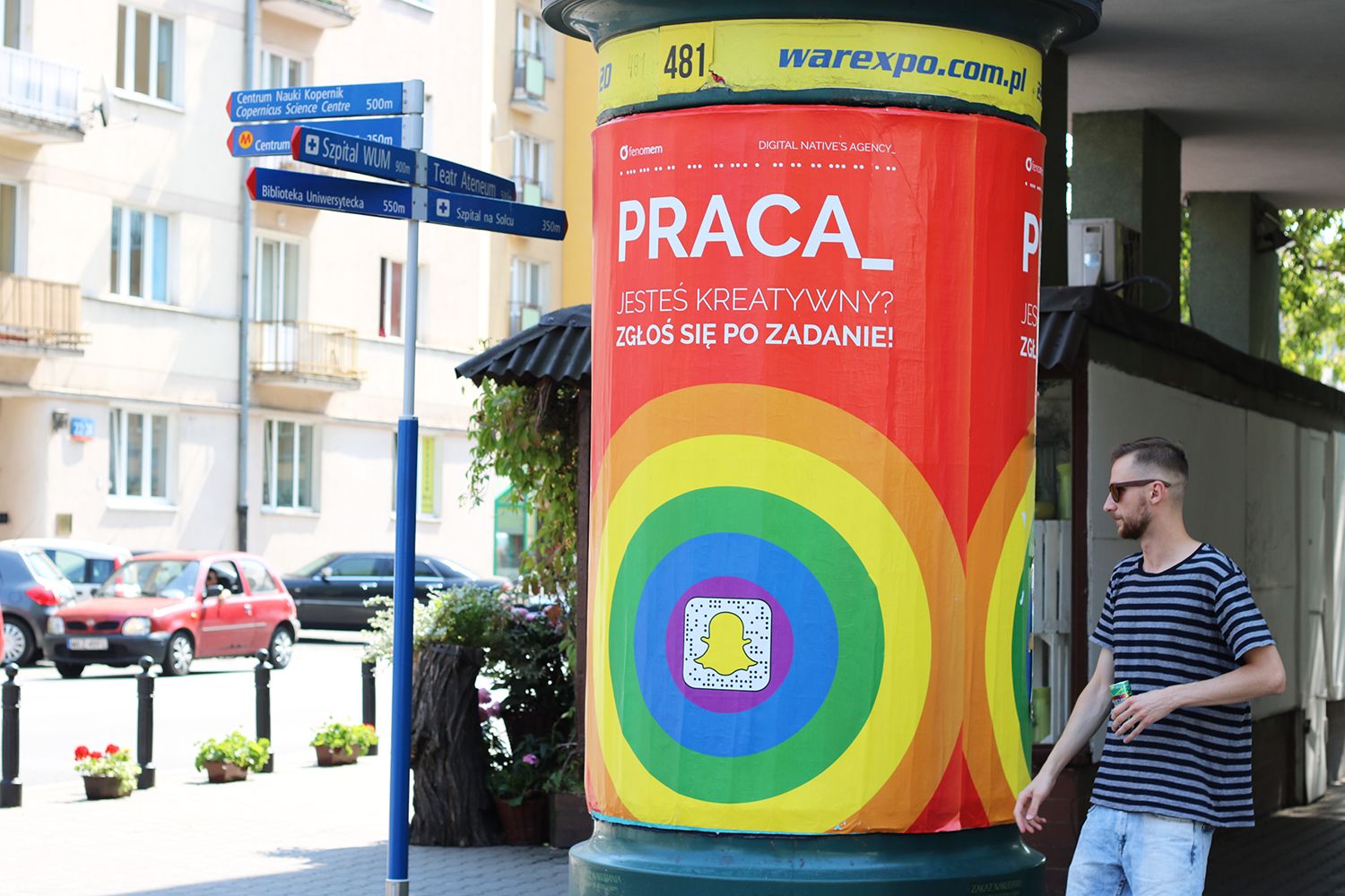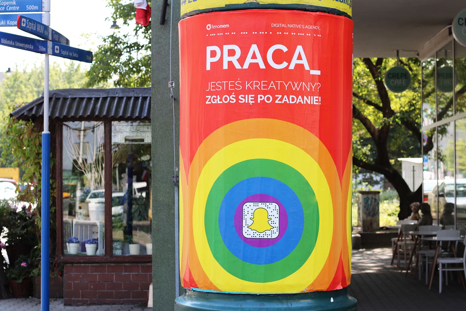 Agencja Fenomem jest autorem niestandardowej, pierwszej w Polsce akcji rekrutacyjnej prowadzonej na Snapchacie. Na czym polega? Na słupie reklamowym, w miejscu gdzie warszawska ulica Tamka krzyżuje się z Dobrą, zamieszczony został plakat rekrutacyjny zawierający prostą instrukcję: „PRACA! Jesteś kreatywny? Zgłoś się po zadanie” oraz snapchatowy kod, który po zeskanowaniu odsyła do profilu agencji. Co 24 godziny odświeżany jest także zachęcający do udziału w rekrutacji komunikat w MyStory na agencyjnym profilu.