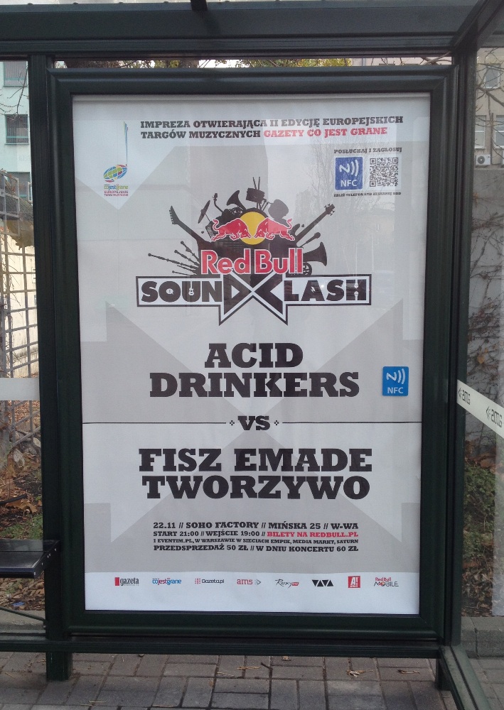 1 listopada br. wystartowała kampania promująca imprezę muzyczną Red Bull Soundclash, wykorzystująca niestandardową reklamę OOH w postaci tzw. “muzycznych wiat”. Na 55 citylightach zlokalizowanych na wiatach przystankowych AMS w Warszawie można zeskanować etykietę NFC przy pomocy telefonu wyposażonego w odpowiedni moduł zbliżeniowy lub alternatywnie – zeskanować kod QR. Etykiety NFC i kody QR prowadzą do strony mobilnej, na której marka Red Bull udostępniła fanom Acid Drinkers oraz Fisz Emade Tworzywo utwory zespołów walczących w Red Bull Soundclash. Strona umożliwia również oddanie głosu na wybrany zespół, co jest przedsmakiem rywalizacji, która odbędzie się 22 listopada w Soho Factory w Warszawie.