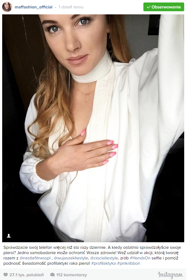 W mediach społecznościowych ruszyła kampania promująca profilaktykę raka piersi prowadzona przez markę Nestlé FITNESS. Marka we współpracy z blogerami zachęca kobiety do badania piersi. Polska odsłona kampanii rozgrywa się w internecie, m.in. na fanpage’ach na Facebooku, czy Instagramie. Użytkowniczki mediów społecznościowych zachęcane są do publikowania selfie z ręką na piersi i hashtagiem #HandsOn. Liquid, część kreatywna MEC, do współpracy przy promocji akcji zaprosił blogerów – m.in. Maffashion oraz Wujaszka Liestyle*, który na potrzeby projektu #HandsOn przygotował specjalną sesję zdjęciową. Za strategię komunikacji i polskie elementy kreacji kampanii #HandsOn Nestlé Fitness odpowiada Liquid. Media do kampanii planuje MEC.