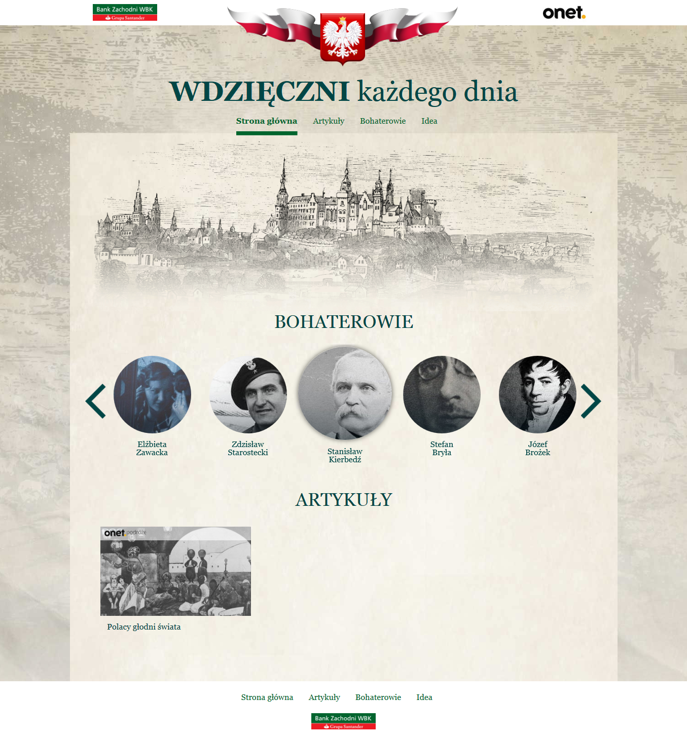 Wspólna akcja Banku Zachodniego WBK z Onetem służy przekazaniu młodemu pokoleniu Polaków niezmiennych wartości, które w swoim życiu realizowali nasi (często zapomnieni) Przodkowie. Chcemy przybliżając konkretne postacie, wskazać zarówno na uniwersalne zasady, którymi się kierowali- takie jak miłość do Polski, pracowitość, poczucie służby, jak i zachęcić współczesne pokolenie Polaków do nowego odczytania tych postaw. Wszędzie tam gdzie żyjemy, pracujemy, uczymy się, potrzebujemy pewnych punktów odniesienia, a takimi są postacie które wspólnie chcemy Państwu zaprezentować. Dzięki takiemu punktowi odniesienia nawet codzienne czynności, w postaci dobrze wykonanej pracy, pomocy sąsiadowi, zaangażowaniu w projekty zmieniające lokalną rzeczywistość- nabierają nowego znaczenia. Myślą przyświecającą idei tego projektu była dewiza wybitnego architekta i patrioty, a zarazem patrona Fundacji Banku Zachodniego WBK, Stefana Bryły: „Trzeba myśleć i trzeba pracować”. Dziś, kierując się tą dewizą chcemy przybliżyć sylwetki 23 wspaniałych Bohaterów, z których możemy być dumni i którzy zasługują na wdzięczność za trud jaki wkładali w budowanie historii i rozwój Polski. – podkreśla cel akcji Piotr Trąbiński, Menedżer ds. marketingu projektów strategicznych BZ WBK.