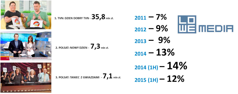 Według najnowszego raportu domu mediowego Lowe Media w 2011 r. przychody z programów typu „live” stanowiły 7% wpływów reklamowych stacji telewizyjnych, cztery lata później było to już 13%.