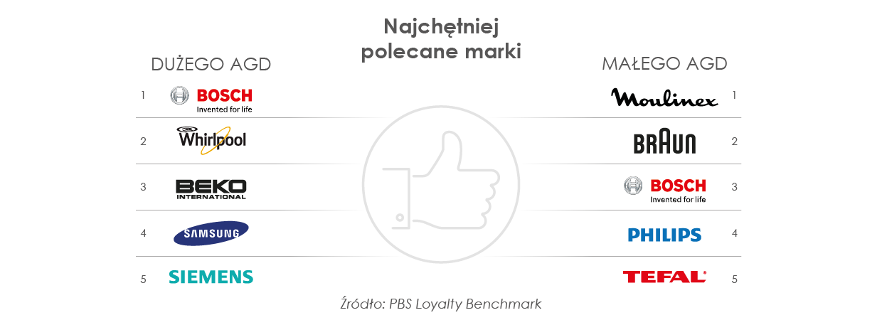 Według najnowszego raportu PBS Loyalty Benchmark, najczęściej polecane marki dużego AGD, o najwyższych wartościach NPS, to Bosch, Whirlpool oraz Siemens. W przypadku producentów sprzętów małego AGD, w 2015 roku najwyższe wartości NPS wskazują klienci marek: Moulinex, Braun oraz Bosch.