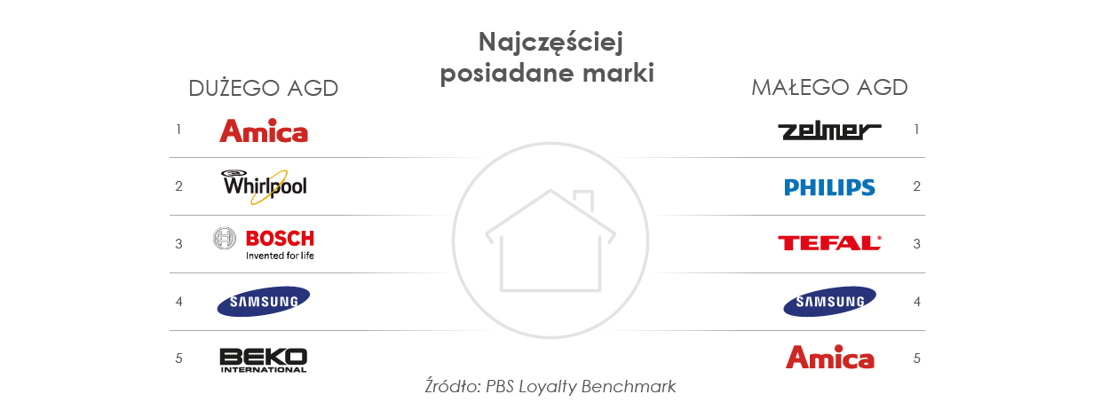 Która marka przekonała do siebie najbogatszych klientów? Według raportu PBS, w polskich domach najczęściej spotkać możemy produkty dużego AGD marek Amica, Whirlpool i Bosch, a w przypadku małego AGD – marek Zelmer, Philips i Tefal. Spośród marek masowych najzamożniejszych klientów mają LG (duże AGD) i Braun (małe AGD), w przeciwieństwie do marek Polar (duże AGD) i Clatronic (małe AGD) – częściej popularnych zwłaszcza wśród osób starszych i mniej zamożnych.