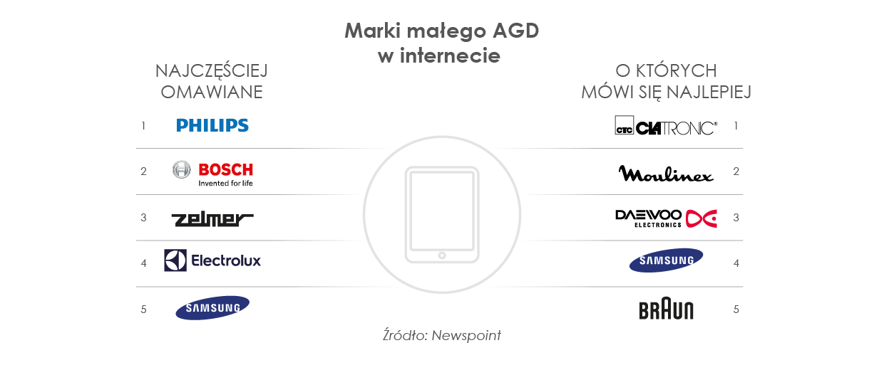 Z badania Newspoint wynika, że internetowy szum wokół urządzeń małego AGD wzrósł dwukrotnie w porównaniu do ubiegłego roku. Newspoint przeprowadził badanie ilościowe, na łącznej próbie około 10 tysięcy wpisów, treści zamieszczanych w internetowych serwisach informacyjnych i mediach społecznościowych dla następujących marek: Amica, Bosch, Braun, Clatronic, Daewoo, Electrolux, LG, Moulinex, MPM Product, Panasonic, Philips, Samsung, Siemens, Tefal, Whirlpool, Zelmer w kontekście produktów małego AGD. Zestawione zostały dwa analogiczne okresy: luty – kwiecień 2014 oraz 2015. Zaledwie 1% internautów negatywnie wypowiada się o zakupionych przez siebie sprzętach małego AGD (spadek o 1pkt% w stosunku do 2014 roku) a 15% rekomenduje innym sprawdzone urządzenia (wzrost o 2 pkt % w stosunku do 2014).