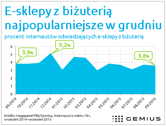 Okazało się, że strony e-sklepów z biżuterią docierają miesięcznie do średnio 3,9 proc. użytkowników sieci powyżej 18 roku życia (747 tys.). Największym zainteresowaniem cieszyły się one w grudniu 2014 roku, a najmniejszym – w kwietniu 2015 roku.
