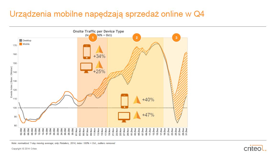 W październiku ruch generowany na urządzeniach mobilnych jest porównywalny do ruchu na desktopach, ale dokładnie w połowie okresu zwanego ‘czasem refleksji’ ma miejsce znacząca zmiana: ruch na smartfonach i tabletach wzrasta o 34%, podczas gdy desktopy odnotowują zaledwie 25% wzrost. W połowie okresu konwersji (ok. 5 grudnia), poziom ruchu generowanego na desktopach i urządzeniach mobilnych znów się wyrównuje. Po Świętach ruch na urządzeniach mobilnych ponownie znacząco wzrasta, niemal do poziomu ‘okresu refleksji’.