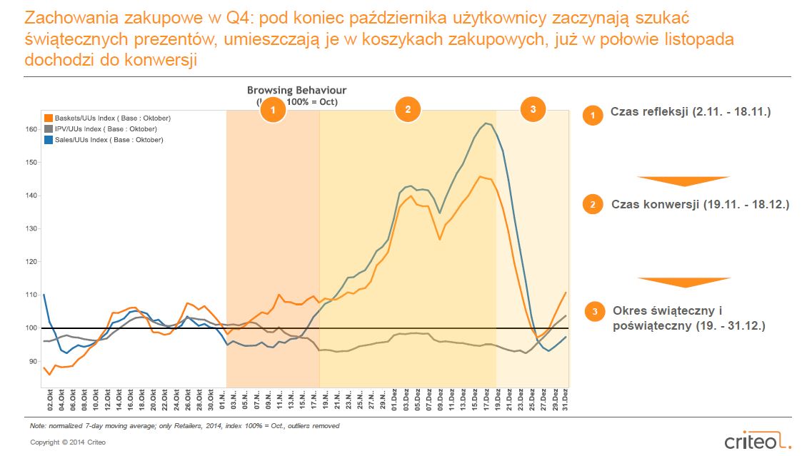 Zachowania zakupowe użytkowników zmieniają się podczas Q4. Pierwsza połowa listopada można być określona jako „czas refleksji”, ponieważ użytkownicy szukają i porównują produkty, po czym zaczynają je umieszczać w koszykach zakupowych. W tym okresie nie dochodzi jednak do konwersji. W kolejnym etapie, tzw. „czasie konwersji” (19.11.-18.12) użytkownicy nadal dodają produkty do koszyków, a wskaźnik sprzedaży na użytkownika rośnie lawinowo.W Boże Narodzenie i okresie poświątecznym (19-31.12.) użytkownicy kupują ostatnie świąteczne prezenty, po czym koszyki pustoszeją, a wskaźnik sprzedaży maleje by znów wzrosnąć na początku roku.