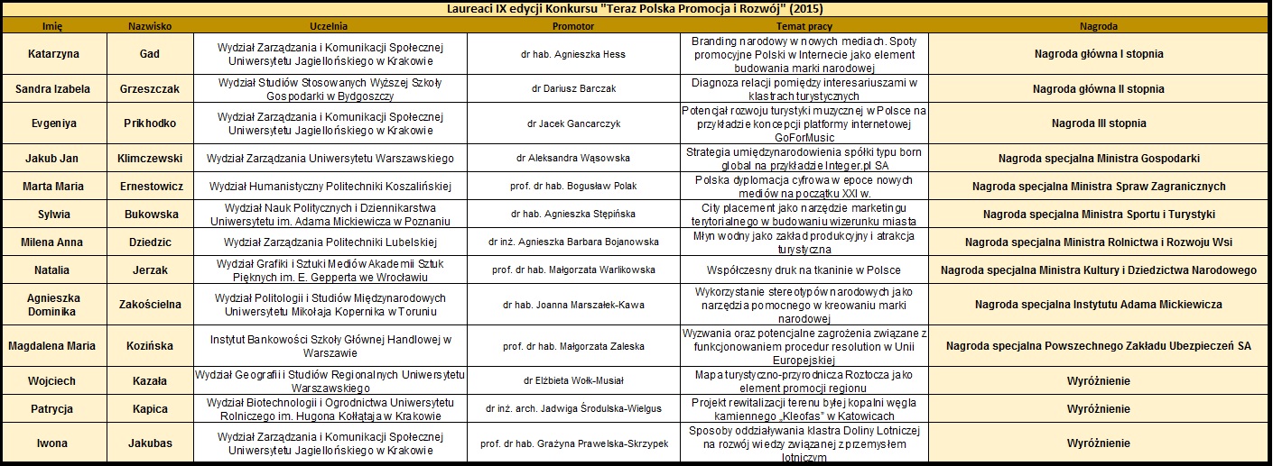W tegorocznej edycji udział wzięło 75 studentów z całej Polski, a nagrody i wyróżnienia trafiły do 13 laureatów. Autorzy najlepszych prac otrzymali nagrody główne oraz nagrody specjalne o łącznej wartości ok. 50.000 zł. Fragmenty zwycięskich prac zostaną opublikowane w e-booku „Teraz Polska Promocja i Rozwój”.
