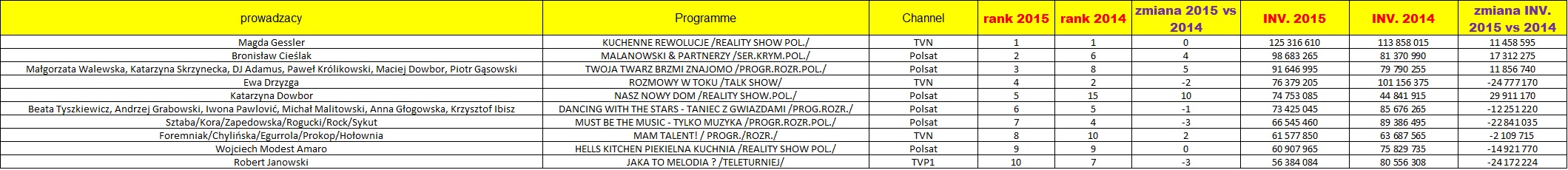 Wśród porażek w tegorocznym zestawieniu można wymienić Roberta Janowskiego, którego program Jaka to melodia spadł w rankingu przychodowym z 6 miejsca w 2014 r. (80,5 mln zł.) na 10 pozycję w roku 2015 (56,4 mln zł.).