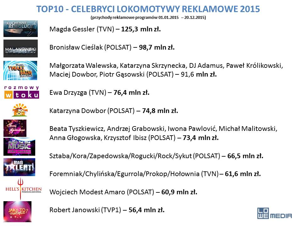 Najbardziej spektakularnym sukcesem może poszczycić się jednak Katarzyna Dowbor, która w 2015 r. po raz pierwszy pojawiła się w pierwszej piątce rankingu Lowe Media. Przychody reklamowe z prowadzonego przez prezenterkę programu Nasz nowy dom w wysokości 74,8 mln zł. katapultowały Dowbor z 15 miejsca w rankingu z 2014 r. na 5 w tegorocznej jego edycji.