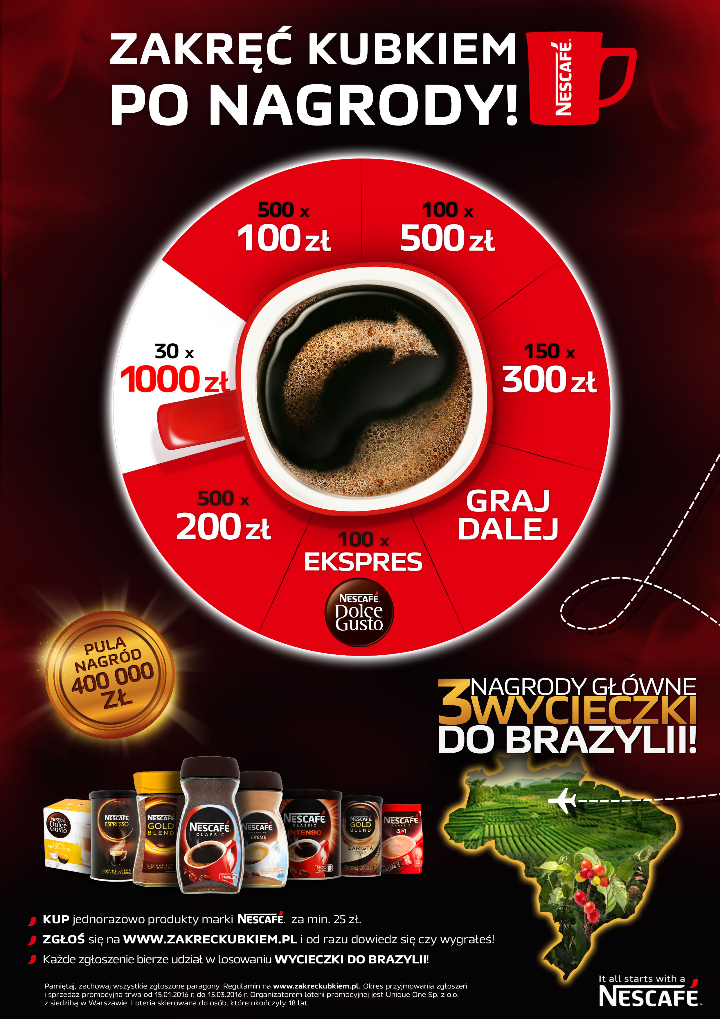 Wygrać można nagrody pieniężne: 100 zł (500), 200 zł (500), 300 zł (150), 500 zł (100), 1000 zł (30) oraz 100 ekspresów NESCAFÉ Dolce Gusto.