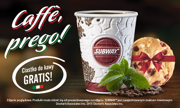 Kampanii Tutto Bene towarzyszy promocja Caffe, prego! Podczas wizyty w restauracji SUBWAY® do każdej zakupionej kawy, klienci otrzymają pyszne, kruche ciastko. Goryczka napoju zostanie zrównoważona małym, słodkim co nieco. Takie duety smakują najlepiej.