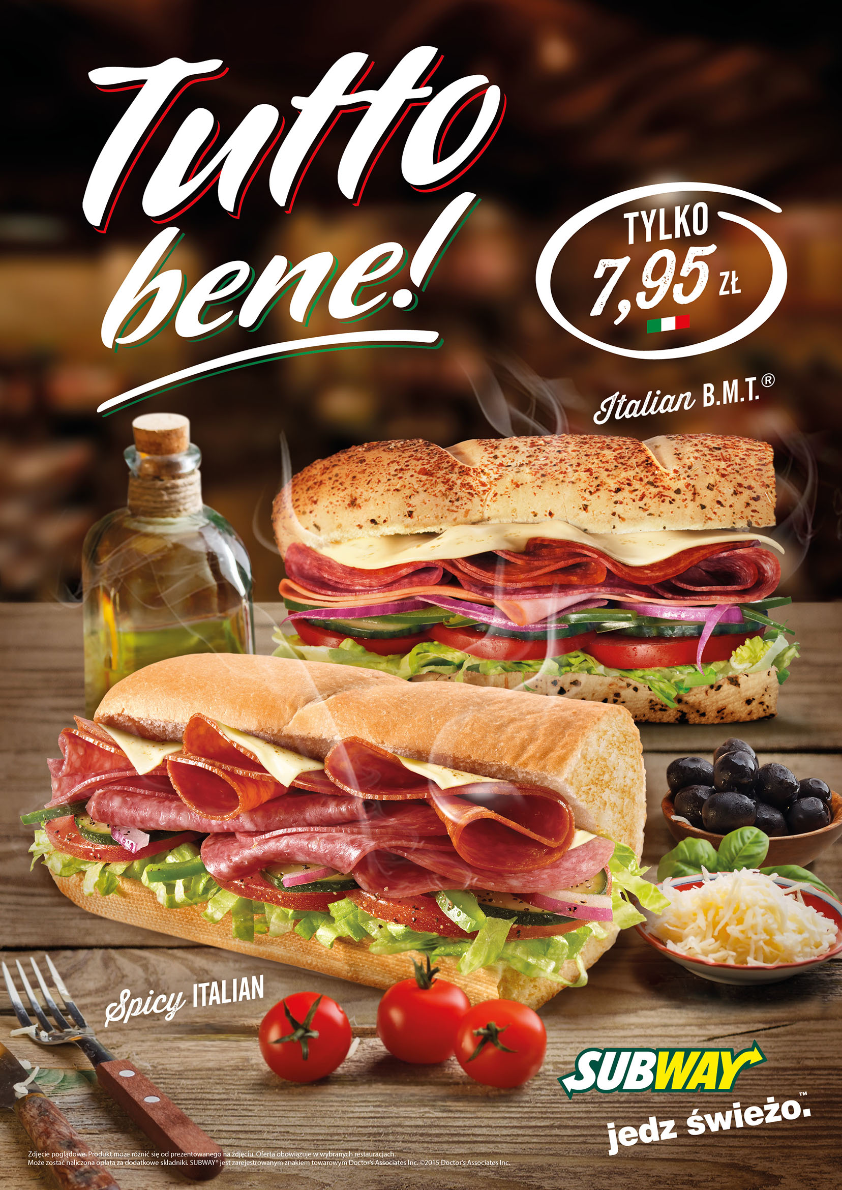 W restauracjach SUBWAY® klienci przypomną sobie lekkie, wakacyjne delicje! Artyści sandwiczowi specjalnie dla nich przygotują dwie pyszne propozycje. Świeże warzywa, chrupiący chleb i soczyste wędliny – to z nich wyczarują smaki, których mógłby pozazdrościć niejeden wybitny top szef. Goście restauracji odkryją Italian B.M.T. oraz Spicy Italian, oba w doskonałej cenie – 7,95 zł za. Miłośnicy kulinarnego szaleństwa poczują przedsmak pysznej zabawy. Promocja Tutto Bene rozpoczęła się w styczniu i będzie trwać do 20 marca.