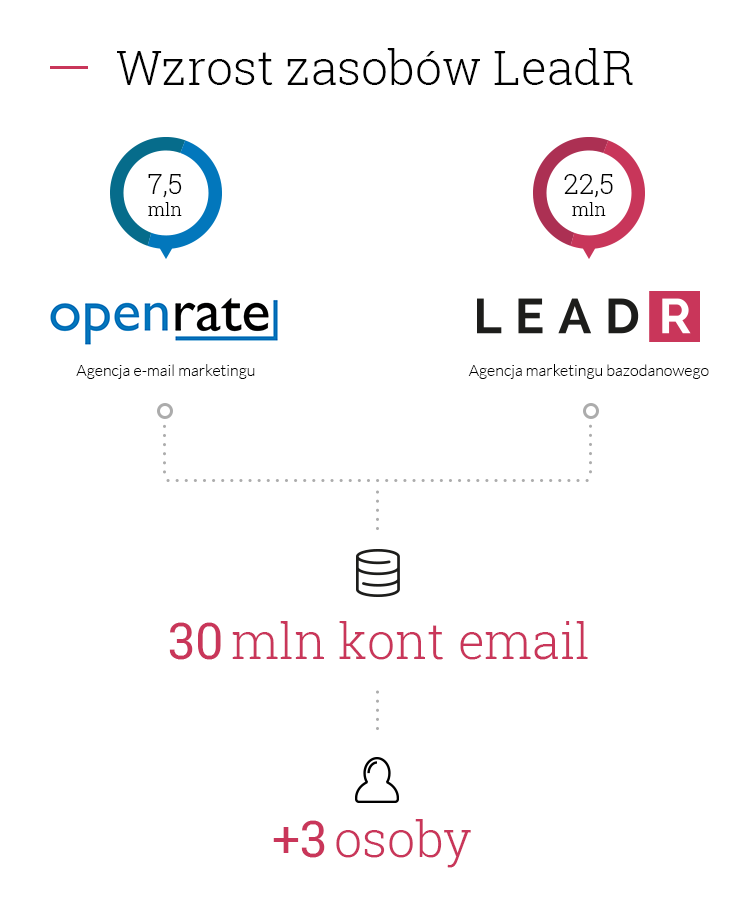 Fuzja oznacza dla LeadR wzrost wolumenu baz o 30% – do 30 milionów rekordów. Obsługą danych zajmie się czternastoosobowy zespół specjalistów. Tak duży wolumen, połączony z technologią profilowanych mailingów, plasuje LeadR w czołówce polskich firm zajmujących się monetyzacją baz danych oraz email marketingiem.