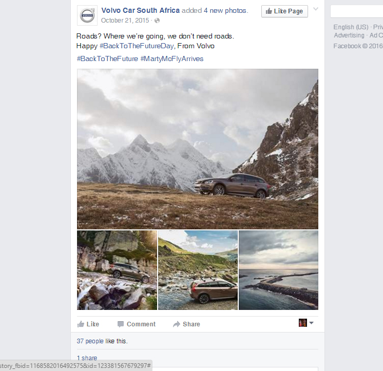 Volvo Car South Africa. BTW. Profil śledzony przez ponad 100 000 ludzi, ile lajków pod postem związanym z „Back To The Future” ? 37… Słownie: trzydzieści siedem. Brawo Wy!