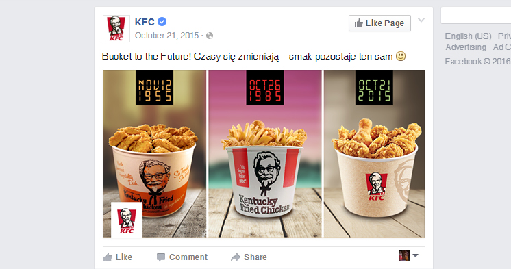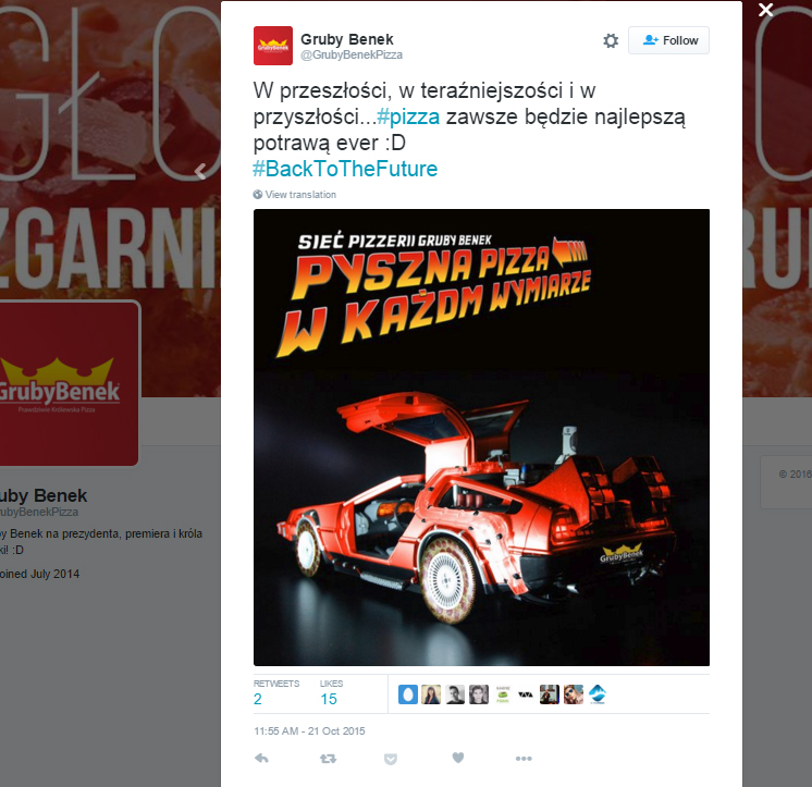 Pizzeria Gruby Benek. Akurat ta firma ma tak spontaniczną komunikację, że jestem w stanie uwierzyć, że obudzili się 21 października, że to „ten 21 października” i przygotowali tę kreację w pośpiechu znanym z Real-Time Marketingu. 😉 Niemniej żadne RTM to nie jest, a niewielka ilość reakcji konsumentów, pokazuje, że zdążyli zostać zanudzeni tematem jeszcze przed południem.