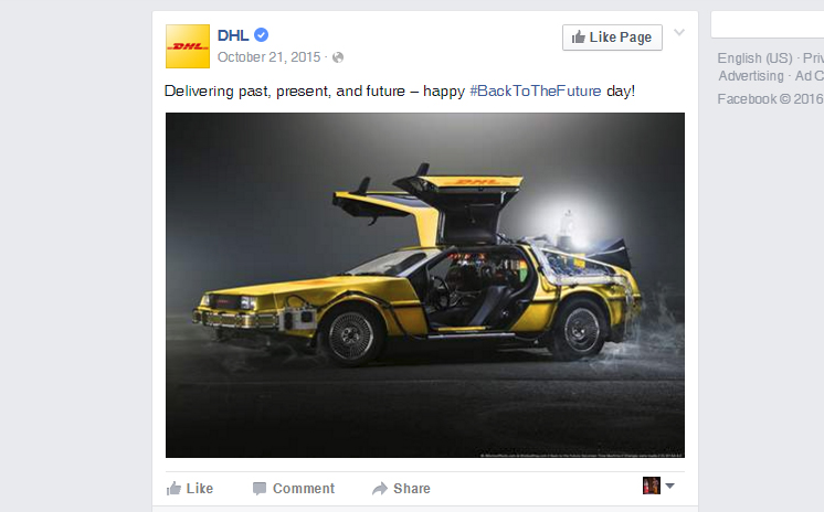 4. Twórz przemyślane treści. Pamiętacie czym zasilany był silnik samochodu Doktora z „Powrotu do przyszłości”? Otóż DeLorean tankowany był śmieciami… Brawa dla marketera, który stworzył poniższą treść: