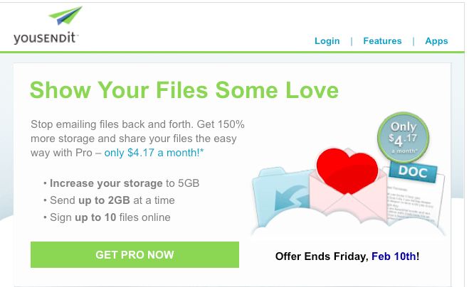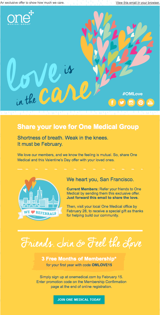 Walentynki to dokonały kontekst komunikacyjny nie tylko w obszarze działań B2C, ale także B2B. Warto wykorzystać ten moment i przypomnieć o sobie subskrybentom, na przykład poprzez specjalną promocję, czy też zabawne nawiązanie do oferowanych przez siebie usług – tak, jak zrobiły to firmy One Medical Group (Love is in the Care) czy Hightail (Show Your Files Some Love).