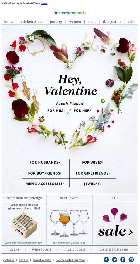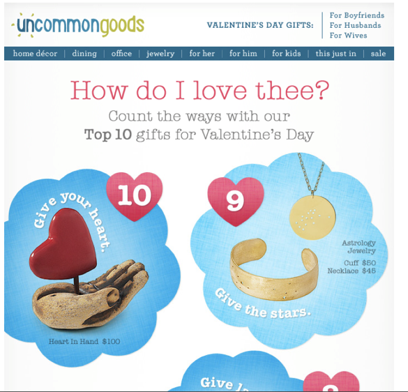 14. lutego może przysporzyć zakochanym prezentowego bólu głowy – marki prześcigają się w okolicznościowych ofertach, niekoniecznie ułatwiając wybór idealnego podarunku w założonym budżecie. Właśnie dlatego, w Walentynki doskonale sprawdzają się wszelkiego rodzaju przewodniki i poradniki prezentowe („gift guides”) oraz listy życzeń. Poza widełkami cenowymi, można wprowadzić w ramach takich wiadomości np. rozróżnienie na prezenty dla żon/mężów i dziewczyn/chłopaków (segmentacja wyłączne na grupy kobiet i mężczyzn może okazać się niewystarczająca) lub listę najlepszych produktów wybranych przez firmę – tak, jak zrobiła to marka UncommonGoods.