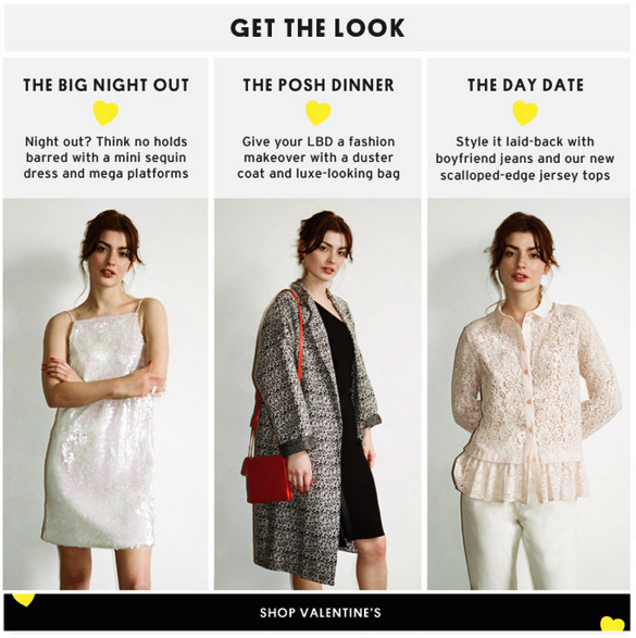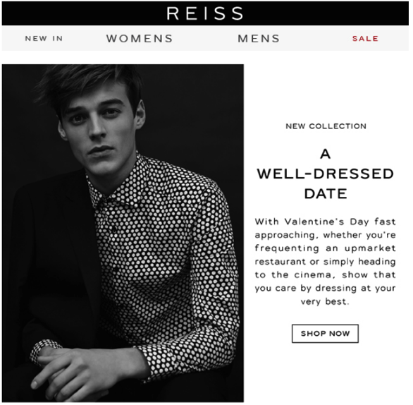 Newsletter firmy Reiss jest idealnym przykładem na to, jak w prosty sposób pobudzić wyobraźnię subskrybenta i odwołać się do pozytywnych uczuć związanych z Walentynkami. Topshop podpowiada natomiast, jak najlepiej się ubrać (korzystając przy tym oczywiście z własnej oferty), w zależności od tego, na jaki rodzaj walentynkowej randki się wybieramy.