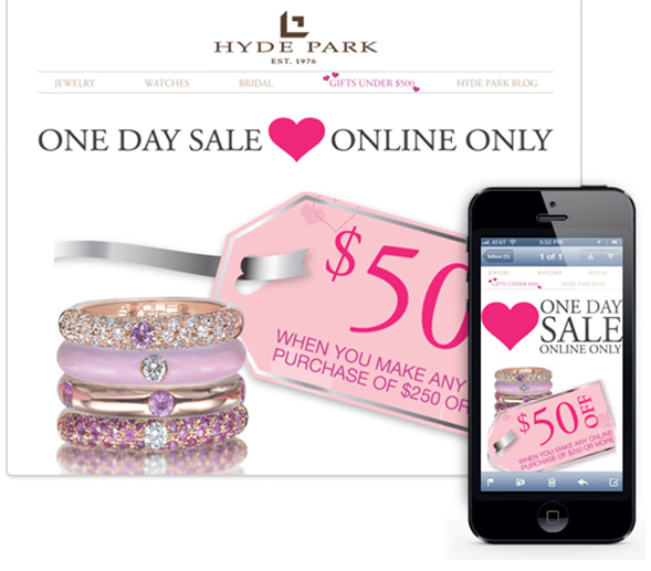 Pamiętając, że coraz więcej wiadomości otwieranych jest na urządzeniach mobilnych, warto zadbać o responsywny design naszego newslettera. Mailing Hyde Park jest w tym miejscu dobrym przykładem, również ze względu na wyróżnienie graficzne walentynkowej oferty specjalnej.