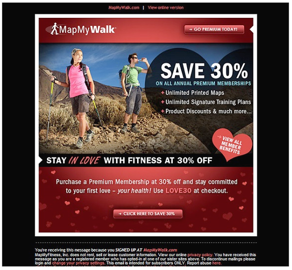 Dzień zakochanych można wykorzystać także w przewrotny sposób, odwołując się do nieco mniej romantycznych relacji, z pozoru zarezerwowanej tylko dla par. Firma MapMyWalk nawiązuje w swoim newsletterze do miłość do zdrowia i fitnessu – trafiając np. do tych, którzy jeszcze nie znaleźli drugiej połówki, bądź też nie podchodzą do tego święta w sposób komercyjny.