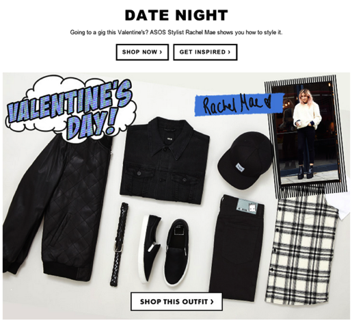 Warto też wyłamać się z typowego, czerwono-różowego designu i „serduszkowego” klimatu (lub potraktować temat z dystansem). Doskonałym przykładem jest np. walentynkowa kampania ASOS, prezentująca produkty idealne na randkę podczas koncertu.