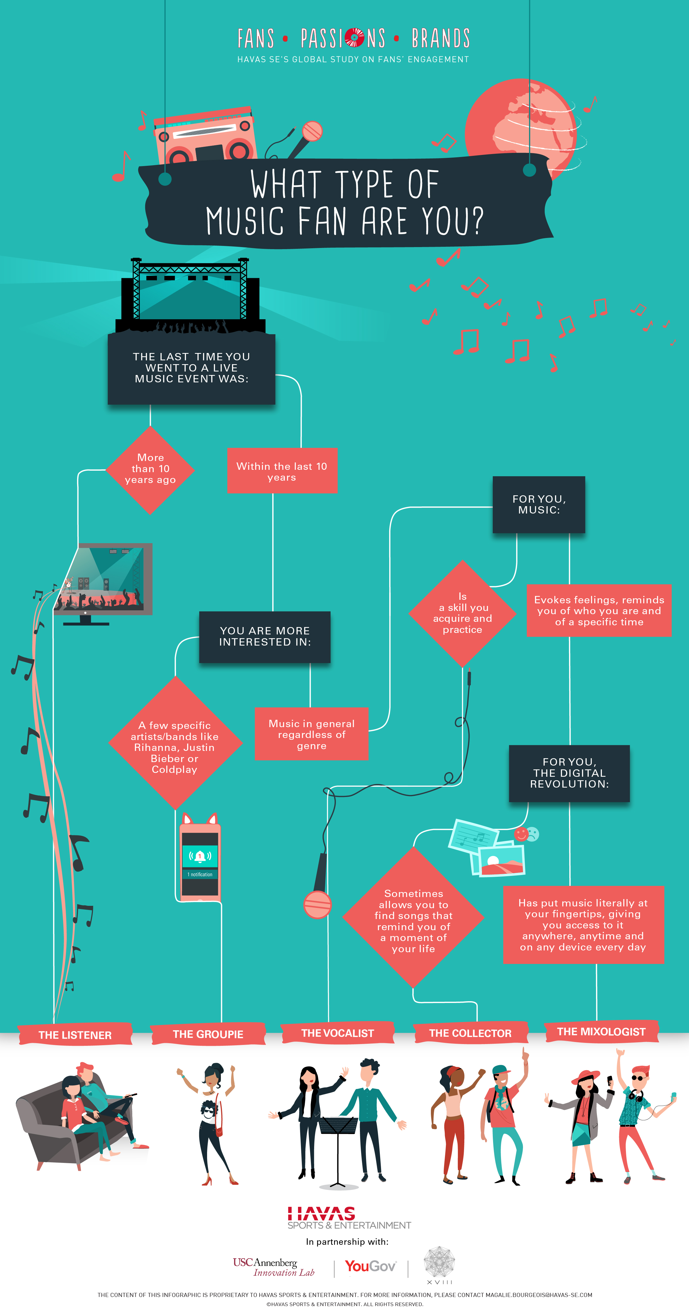 Badanie „FANS.PASSIONS.BRANDS” przeprowadzone przez Havas Sports & Entertainment, dotyczące zainteresowania sportem i rozrywką, wykazało również, że 56% dzisiejszych entuzjastów muzyki przyznaje się do słuchania przynajmniej dziesięciu różnych gatunków. Poprzednie badanie, przeprowadzone przez Havas Sports & Entertainment, ujawniło istnienie „Generacji Shuffle” – nowego pokolenia osób słuchających muzyki, które wywodzi się z rewolucji cyfrowej. Dzięki niespotykanemu nigdy wcześniej dostępowi do ogromnych bibliotek nagrań, możliwemu w związku z pojawieniem się streamingu i opcji pobierania plików online, zdecydowanie wzrosła różnorodność gatunków muzycznych, których słuchają ich użytkownicy. Badanie przeprowadzone we współpracy z Annenberg Innovation Lab z Południowej Kalifornii dotyczyło zainteresowania ludzi muzyką, a jego celem było zrozumienie, w jaki sposób muzyka oddziałuje na poszczególne osoby i ich relacje z markami w tej przestrzeni. Badanie wykazało, że zdaniem 73% ludzi partnerstwo muzyczne poprawia wizerunek marki, a w opinii 70% ankietowanych sprawia, że marka wyróżnia się spośród swoich konkurentów. Zdaniem 62% muzyka zachęca ich do wypróbowania produktów i usług danej marki.