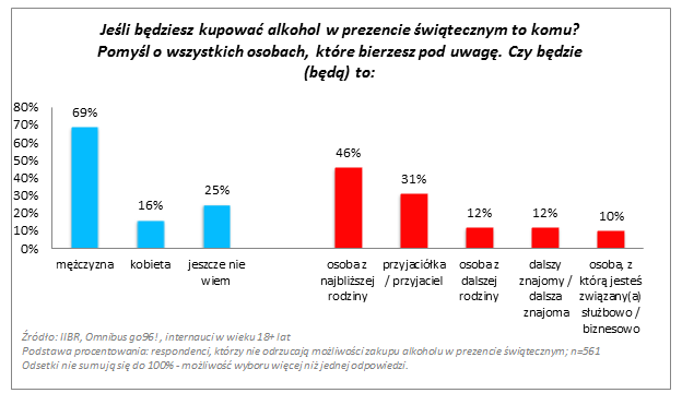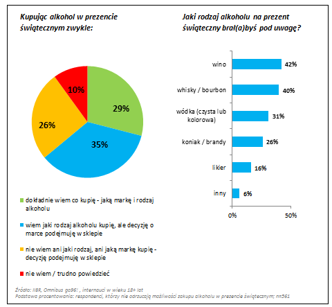 Jedynie co trzecia (29%) osoba uwzględniająca alkohol wśród planowanych zakupów upominkowych jest zdecydowana co do jego rodzaju i marki. 15% polskich internautów kupiło w ubiegłym roku alkohol w prezencie świątecznym. W tym roku taki zakup planuje podobne grono konsumentów (13%), a niemal dwa razy więcej (25%) nie odrzuca takiego pomysłu. Potwierdza się opinia, że alkohol jest raczej męskim upominkiem (jest częściej dawany i otrzymywany przez mężczyzn). Zamiar przekazywania alkoholu w prezencie świątecznym występuje częściej wśród osób lepiej wykształconych i zamożniejszych. Na decyzję zakupową nie ma jednak wpływu wiek klientów ani wielkość miejsca zamieszkania. Najchętniej kupujemy ten typ prezentów bliskim – najbliższej rodzinie czy przyjaciołom.