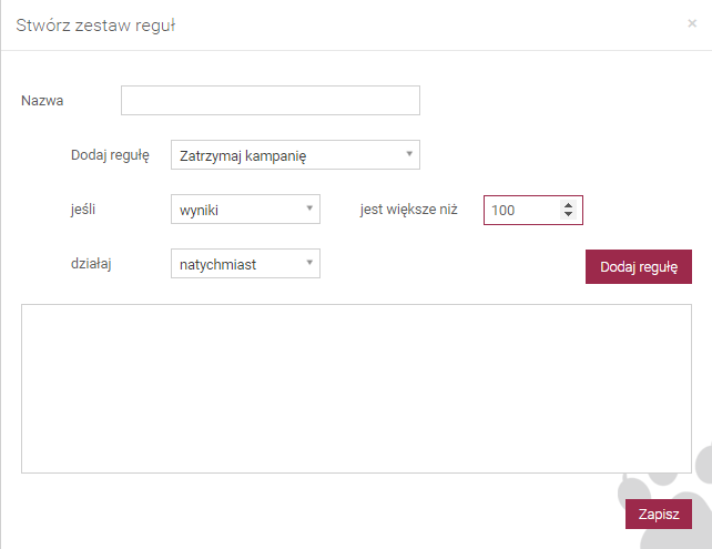 Dzięki Catvertiserowi możesz teraz również wykorzystać reguły autooptymalizacji. Wystarczy wybrać opcję „zatrzymaj adsety” a następnie zdefiniować zasadę ich wyłączenia. Przykładowo, jeżeli chcesz by zestaw został zatrzymany po przekroczeniu 100 polubień strony to wybierz z kategorii „jeśli” wyniki a następnie w sekcji „jest większe niż” wpisz 100. Pamiętaj, aby zdefiniować regułę przed przystąpieniem do procesu tworzenia kampanii.