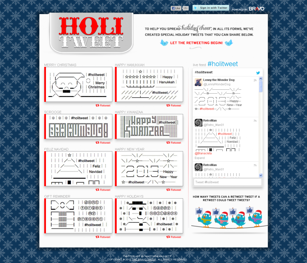 Amerykańska agencja Bravo Creative przygotowała świąteczną kampanię na Twitterze. Na początku grudnia powstała platforma holitweet.com ze stworzonymi przez specjalizującego się w twitterowej grafice (@tw1tt3rart) artystę Matthew Haggetta, szablonami świątecznych życzeń.