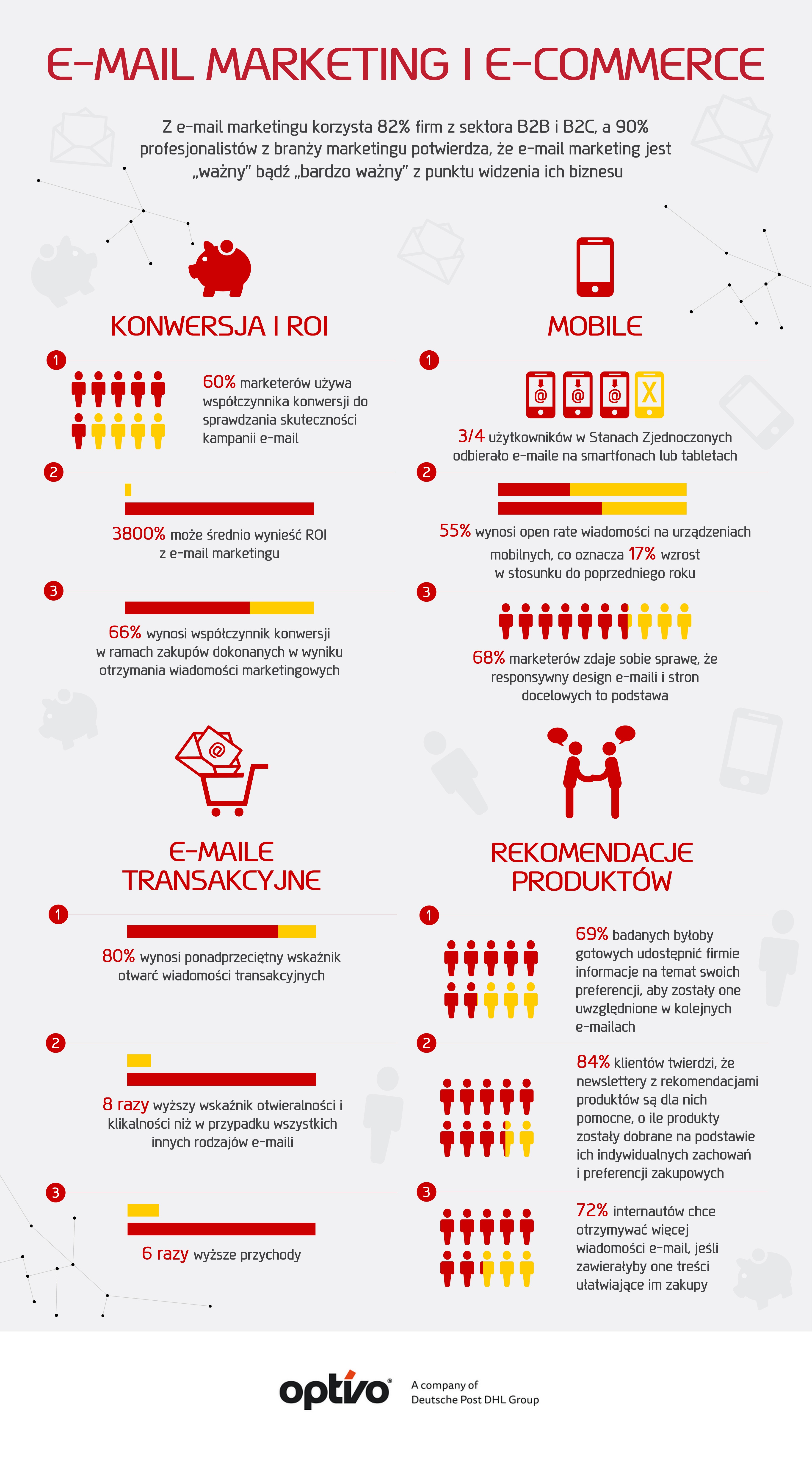 Profesjonalnie realizowany e-mail marketing może przynieść bezkonkurencyjne wyniki – zarówno jeśli chodzi o wskaźnik zwrotu z inwestycji, jak i konwersji. ROI z prowadzonych działań e-mail marketingowych może poszybować wysoko w górę, nawet do 3800%. Współczynnik konwersji wynoszący nawet 66% potwierdza natomiast, że wiadomości marketingowe są bardzo efektywnym narzędziem zachęcania klientów do dokonania zakupu.