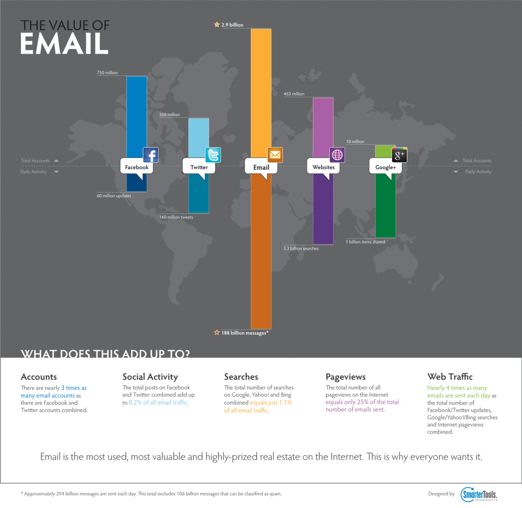 Zgodzę się, że e-mail marketing nie jest może tak “sexi” i “trendi” jak social media czy reklama video. E-mail marketing w odróżnieniu od innych form komunikacji w sieci ma jedną niepodważalną zaletę – jest naprawdę efektywny. Jeżeli spojrzymy na badania opublikowane przez Direct Marketing Associacion za rok 2011 okazuje się, że statystyczna złotówka włożona w e-mail marketing generuje ponad 40 złotych sprzedaży. Dla porównania na drugim miejscu tego rankingu znajdują się działania SEM, które generują ROI na poziomie 1 do 22. Oczywiście nie jest to jedyne badanie, które pokazuje niezwykłą efektywność działań w ramach tego kanału komunikacji. Amerykańska firma Focus przeprowadziła badania zgodnie z którymi pomimo tego że, na e-mail marketing nie idą największe inwestycje w ramach budżetów marketingowych to nadal jest on najbardziej efektywnym kanałem dotarcia do odbiorców. W badaniu tym social media – najbardziej doinwestowana branża marketingu zajmuje dopiero trzecie miejsce pod względem efektywności. Dodatkowo warto zwrócić tutaj uwagę na pewną infografikę przygotowaną przez Smarter Tools. Analizując ją widzimy dominację e-maila nad innymi aktywnościami, którym poświęcamy czas korzystając z Internetu. W tym miejscu warto jeszcze podkreślić, że e-mail czy tez e-mail marketing zasadniczo nie stają w pojedynku z innymi kanałami komunikacji – raczej powinien stanowić spoiwo, wspólny mianownik pomiędzy różnymi kanałami komunikacji oraz różnymi systemami, w których przetwarzamy dane potencjalnych czy też obecnych klientów.