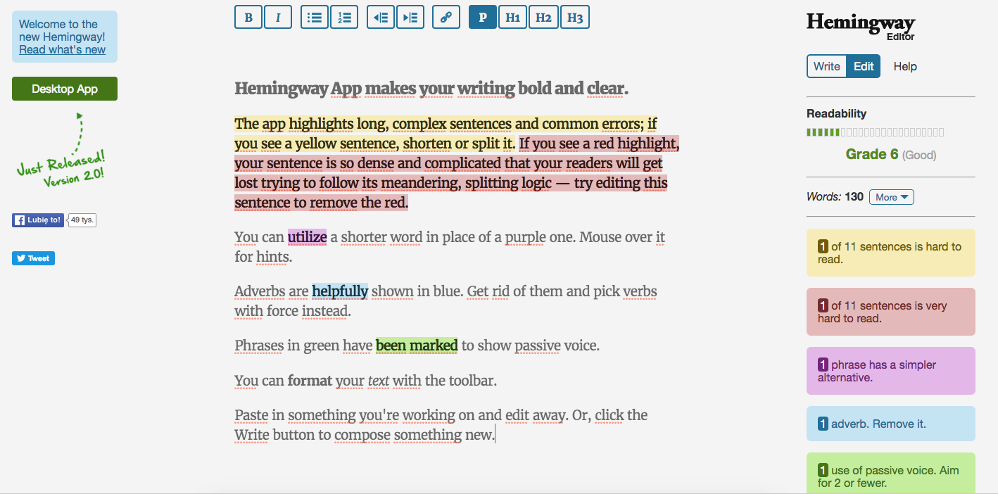 1. Hemingway App – aplikacja, która pokaże Ci, które zdania w Twoim tekście wymagają doszlifowania, np. są za długie.