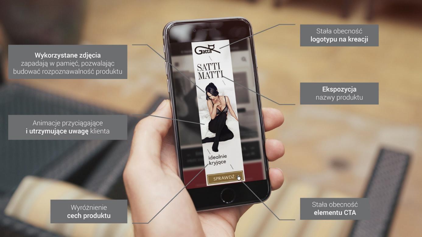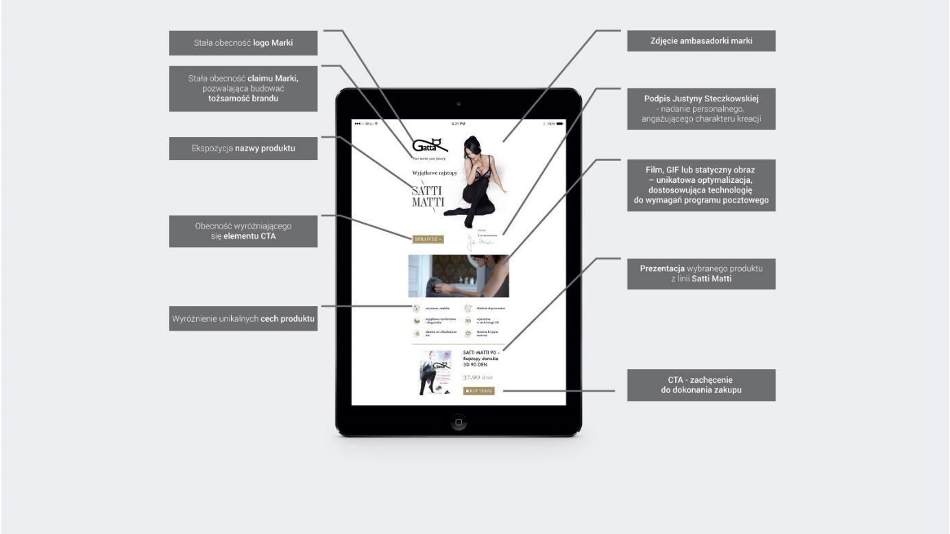 Na potrzeby kampanii opracowaliśmy kreacje reklamowe prezentujące zarówno markę Gatta, jak i wizerunek Justyny Steczkowskiej – wraz z produktem i elementami Call to Action. Dzięki temu ponownie uzyskaliśmy efekt zarówno brandingowy jak i performance’owy. Bannery zostały wykonane w technologii HTML5, aby poprawnie wyświetlać się na wszystkich urządzeniach i przeglądarkach.