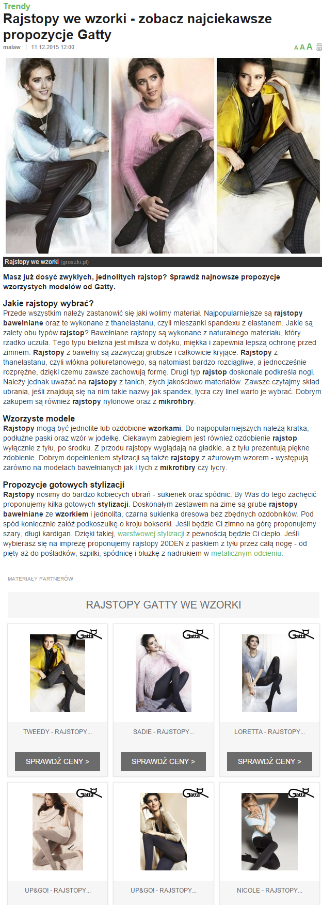 Dla w kampanii marki Gatta wykorzystaliśmy także reklamę natywną. W ramach tych działań, przy artykułach o tematyce modowej – pasujących do Grupy Docelowej – zamieszczane były reklamy graficzne z produktami pasującymi do treści.