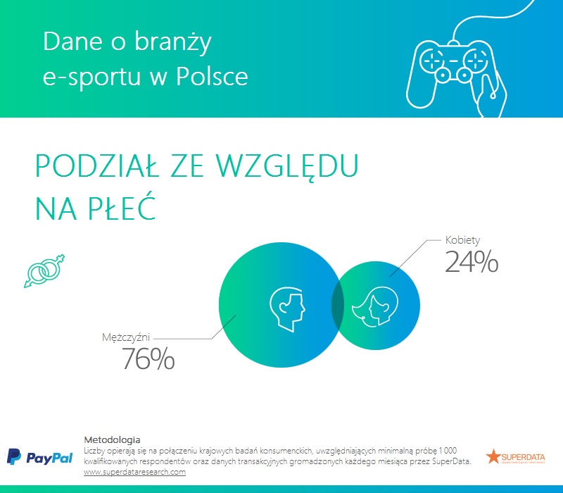 Co wiemy o Polskich fanach e-sportu? Podział płci jest podobny do Europejskiej średniej – 76% mężczyzn i 24% kobiet. Niemniej jednak, kiedy spojrzymy na wszystkie przebadane rynki okazuje się, że odsetek żeńskiej publiczności jest największy właśnie w Polsce. Dla porównania, w Hiszpanii jest ich tylko 13%, a w Rosji – 15%.