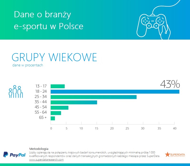 Polska wyróżnia się również pod względem grupy najmłodszych graczy – ale w odwrotny sposób. Jedynie 3% polskich fanów e-sportu należy do grupy wiekowej 13 – 17 lat. Podobna sytuacja ma miejsce w Rosji, ale średnia europejska jest ponad czterokrotnie wyższa (13%), a na rynkach takich jak Franca czy Grecja sięga nawet 20%. Jaka grupa wiekowa ogląda więc e-sport najczęściej? Zgodnie z badaniem, w Polsce są to fani w przedziale 18 do 24 lat (43%). Jeśli ponownie weźmiemy pod uwagę dane dotyczące wartości e-sportu i liczby graczy widzimy natomiast, że statystyczny polski gracz przekłada się na 19 dolarów przychodów e-sportu rocznie.