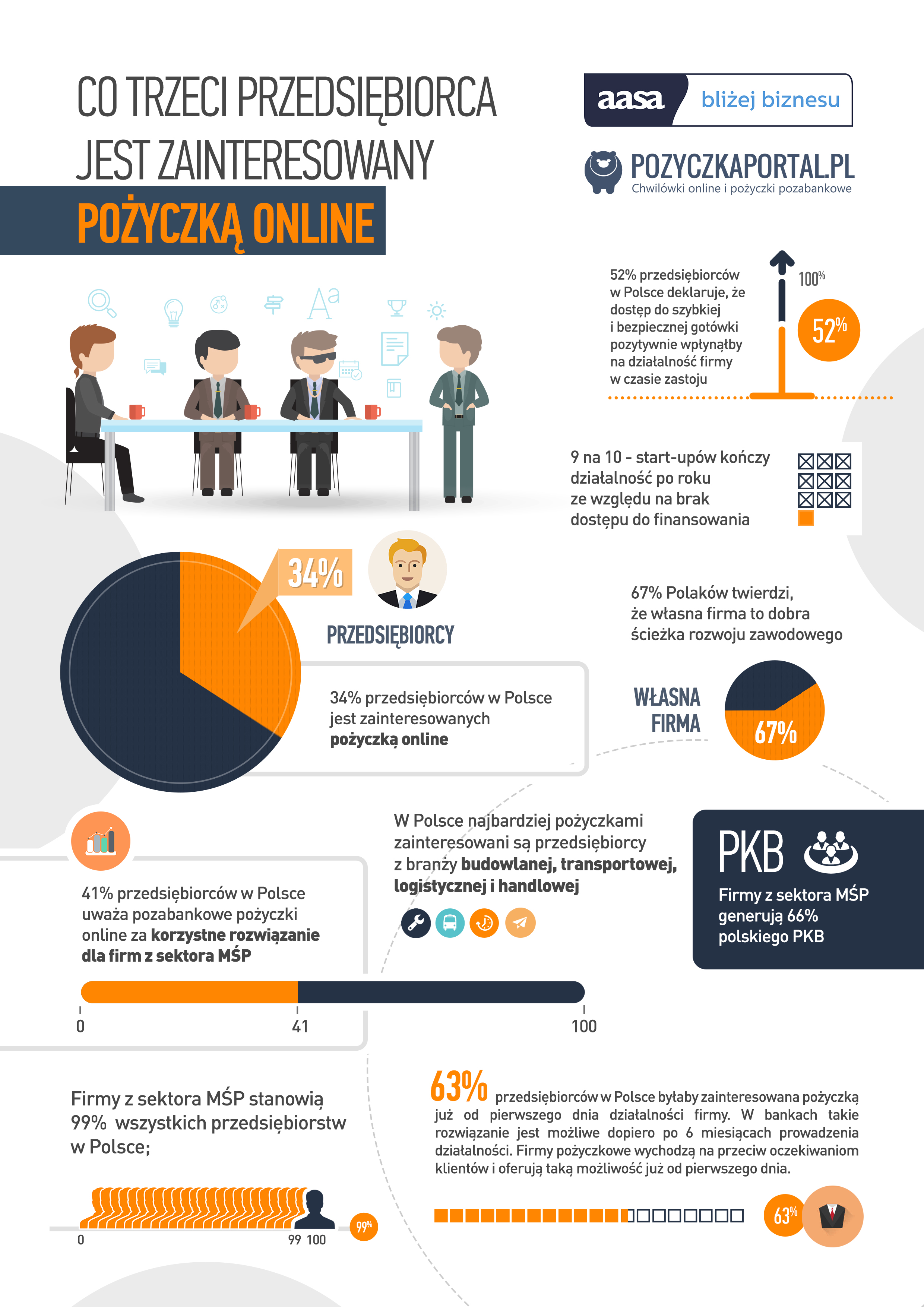 Z badania pozyczkaportal.pl i aasadlabiznesu.pl wynika, że uzyskaniem dodatkowych środków finansowych najbardziej zainteresowani są przedsiębiorcy działający w branży budowlanej, transporcie, logistyce i handlu. To małe i średnie firmy działające w tych obszarach są najbardziej narażone na brak płynności finansowej czy chwilowe zastoje w działalności. Przedsiębiorcy często mimo braku zleceń czy zamówień muszą utrzymać całą załogę, a kiedy firmowe konto świeci pustkami jest z tym kłopot. W takiej sytuacji skutecznym rozwiązaniem mogą okazać się dedykowane małym i średnim przedsiębiorstwom pożyczki udzielane przez duże i stabilne instytucje pozabankowe. Firmy z sektora MŚP według szacunków ekspertów stanowią blisko 99 proc wszystkich przedsiębiorstw w Polsce i generują 66 proc. polskiego PKB, więc rozwiązania pomagające optymalizować ich działanie pozytywnie odbiją się również na polskiej gospodarce.