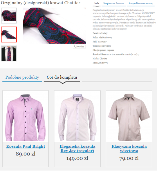 Bardzo dobrze robi to sklep Jegoszafa.pl, który nie tylko zwraca się bezpośrednio do Klienta, ale także doradza na jakie okazje będzie pasował krawat i z jaką koszulą można go zestawić. To zapewne dla wielu Panów wartościowa informacja, gdyż nie rzadko mają oni problemy ze skomponowaniem swojego ubioru. To także umożliwia zwiększenie sprzedaży poprzez crosselling.