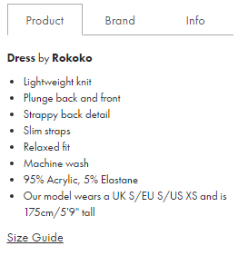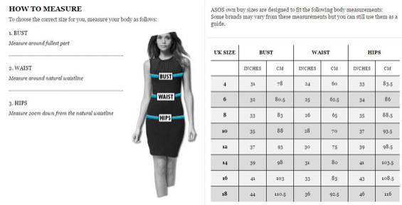 Asos.com pod opisem produktu umieszcza link, który powoduje wyświetlenie się pop up-a z opisem dokładnych wymiarów oraz instrukcją jak zmierzyć swoje ciało, by móc dopasować rozmiar do siebie.