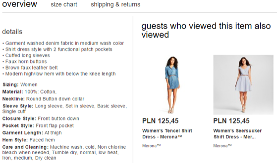 Z kolei Target.com zadbał także o poinformowanie Klientów, jak dbać o ubranie, opisał poszczególne jego elementy, a także oprócz tabeli rozmiarów umieścił informację o tym, jak zakupić lub zwrócić towar i co jeszcze może zainteresować Klienta (co oglądali inni).