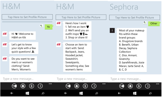 Kik jest komunikatorem mobilnym, którego używa obecnie ponad 250 milionów użytkowników. Jest popularny przede wszystkim w młodszych grupach wiekowych – szacuje się, że z aplikacji korzysta 40% amerykańskich nastolatków. Boty dostępne w komunikatorze podzielone są na 3 grupy – Entertainment (m.in. Vine, Funny Or Die, Riffsy), Lifestyle (m.in. H&M, Sephora) i Games. W przypadku botów rozrywkowych dostarczają one treść zależną od wpisanego keywordu, jednak jeżeli chodzi o boty H&M i Sephora użytkownicy są zachęcani do rozwiązania quizu, pod kątem którego zostaną następnie dopasowane sugestie produktowe. W dodatku do wyszukiwań keywordów w sekcji Entertainment, wszystkie boty Kik reagują na proste polecenia wyświetlane w treści ich wiadomości.