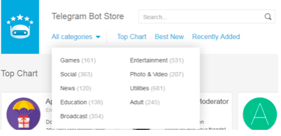 W przypadku komunikatora Telegram oficjalny Bot Store narzędzia developerskie zostały udostępnione w 2015, liczba botów jest więc o wiele większa niż w przypadku Kik czy Facebook Messenger. Obecnie można wybierać z ponad 1.000 chatbotów podzielonych na kategorie, większość z nich nie jest jednak powiązana z żadną marką. Spośród markowych botów można znaleźć m.in. Netflix czy AliExpress.