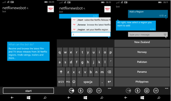 Netflix Bot umożliwia dostęp do najnowszych wiadomości o ofercie Netflix w 38 regionach. Komendy botowi wydaje się, poprzedzając je znakiem „/” – rozsuwa się wtedy menu z możliwymi komendami, po wybraniu ich mogą pokazać się dodatkowe opcje (np. wybór regionu). Wiadomości o ofercie przesyłane przez bota zawierają informacje o premierze, tytule i gatunku filmu oraz ocenę na IMDB i link do odpowiedniej strony Netflix. Użytkownik może także poprosić o więcej informacji oraz zobaczyć trailer.