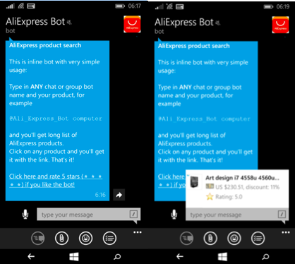 AliExpress Bot jest o wiele prostszy i jednocześnie bardziej niewygodny w obsłudze. Umożliwia dostęp do listy produktów w wybranych kategoriach produktowych, jednak nie posiada on takich ułatwień jak lista poleceń do wyboru – wszystkie komendy trzeba wpisać ręcznie, poprzedzając je nazwą bota (np. @Ali_Express_Bot computers). Lista produktów udostępniona po jej wpisaniu jest umieszczona na bardzo niewielkim polu i staje się niewygodna w przeglądaniu. W tym przypadku zdecydowanie łatwiej skorzystać ze strony mobilnej.